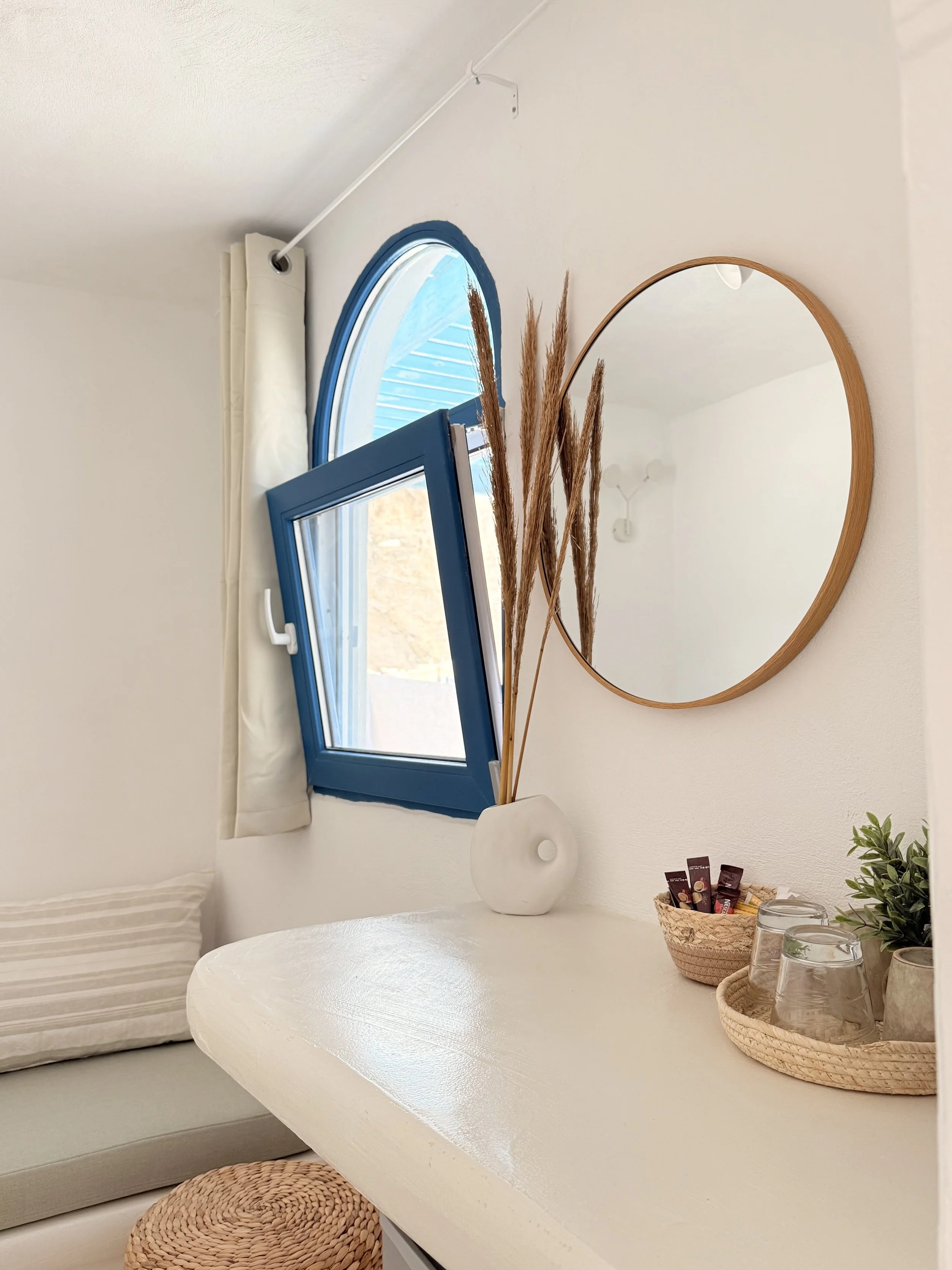 Decorative interior with a round wall mirror, a round vase with dried plants, an open kitchen window with a curtain, a small sofa with a striped pillow, and baskets of snacks and glasses on a counter. Cal Day Rooms Santorini